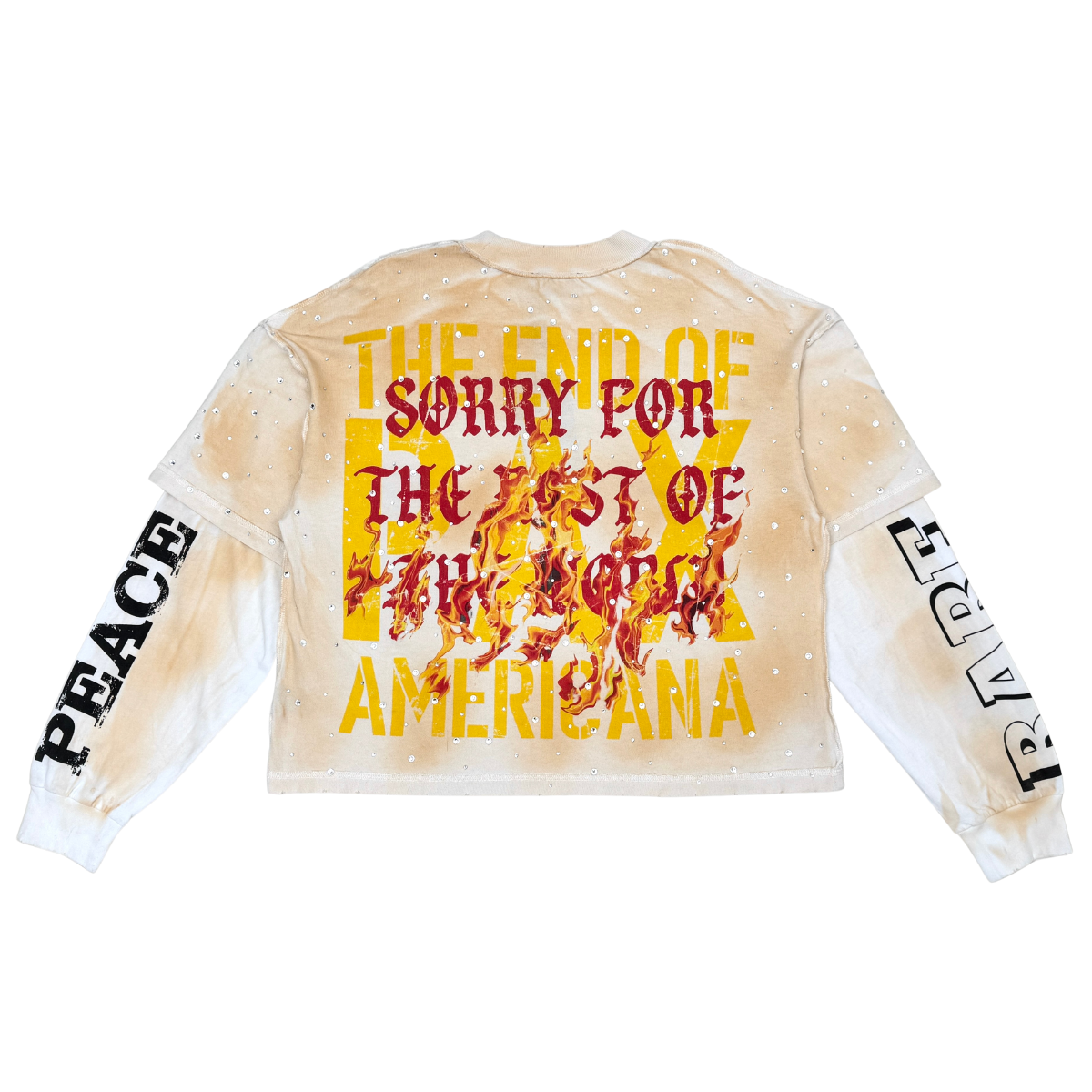 A statement piece that blends vintage wash, digital fire graphics, and rhinestone accents for a look that’s loud and unapologetic. The cropped two-fer design delivers layered energy with bold RARE PEACE sleeve hits and “End of an Era” front and back prints.
