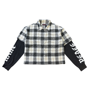 Statement layering made simple. A cropped plaid button-up fused with sweatshirt sleeves featuring bold RARE PEACE prints. The rhinestone-dotted plaid adds subtle shine, while the black cotton sleeves bring contrast and attitude.